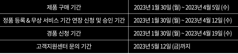 - 본 이벤트는 이벤트 제품 구매 기간인 2023년 1월 30일(월)부터 2023년 4월 5일(수)까지 구매한 대상 제품만 응모가 가능하며, 구매 기간 내에 제품 구매 후, 2023년 4월 12일(수)까지 정품 등록과 무상 서비스 기간 연장 신청 및 승인 완료 후, 2023년 4월 19일(수)까지 본 이벤트 페이지에서 경품 신청을 완료하여야 합니다. (경품 이벤트의 경우 [경품 신청하기] 버튼을 눌러 신청을 희망하는 경품을 선택 → [신청 완료하기] 버튼 클릭까지 완료되어야 경품을 받으실 수 있습니다.)