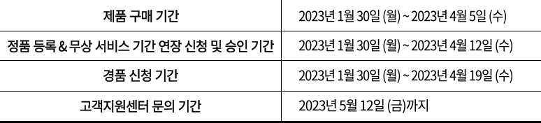- 본 이벤트는 이벤트 제품 구매 기간인 2023년 1월 30일(월)부터 2023년 4월 5일(수)까지 구매한 대상 제품만 응모가 가능하며, 구매 기간 내에 제품 구매 후, 2023년 4월 12일(수)까지 정품 등록과 무상 서비스 기간 연장 신청 및 승인 완료 후, 2023년 4월 19일(수)까지 본 이벤트 페이지에서 경품 신청을 완료하여야 합니다. (경품 이벤트의 경우 [경품 신청하기] 버튼을 눌러 신청을 희망하는 경품을 선택 → [신청 완료하기] 버튼 클릭까지 완료되어야 경품을 받으실 수 있습니다.)